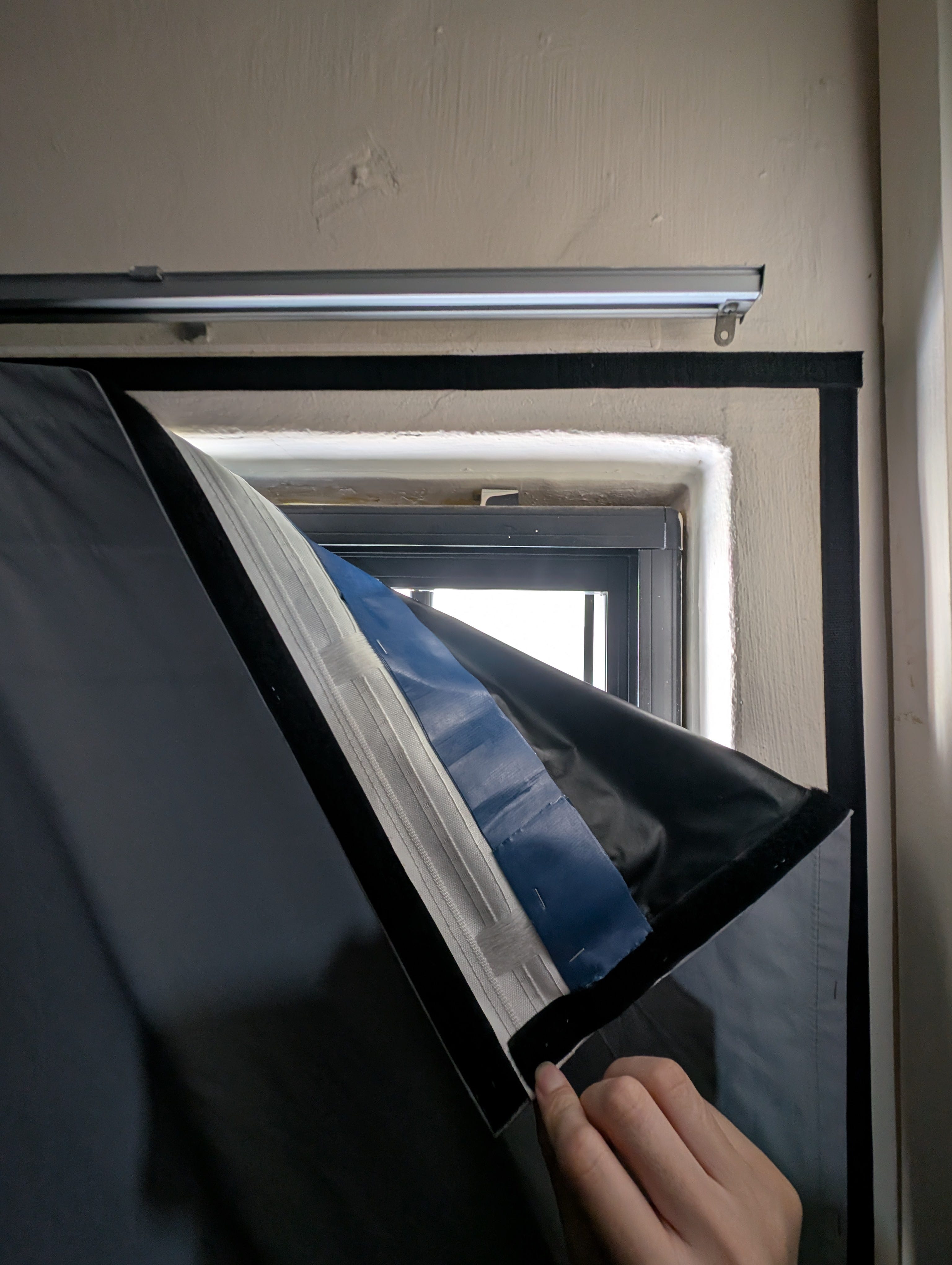 Getting blackout curtains is the easy part. Just hanging the curtain the normal way is not enough as there are gaps where light will leak. I want to come up with a solution where I can flush the curtain to the wall and have it easily removable to ventilate the room.