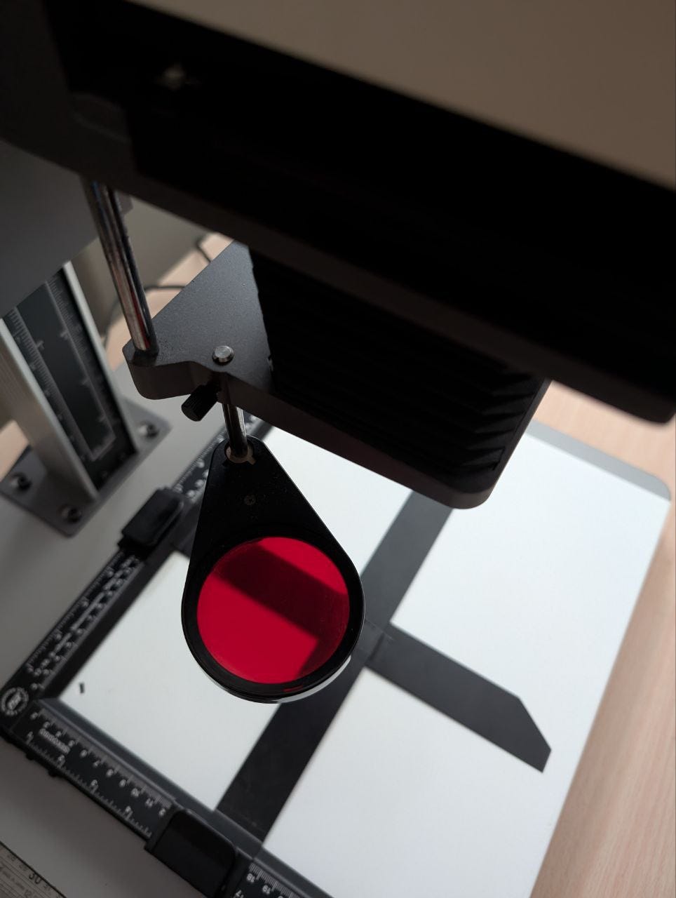 There are many other functions on the darkroom enlarger, like this red filter. As darkroom paper is not sensitive to red light, the image passing through red light allows me to position my paper in the dark without risking exposure.